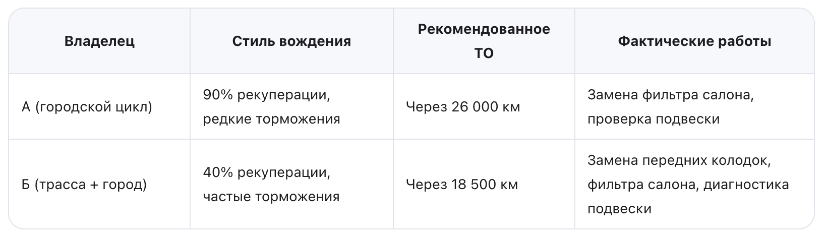 Владелец А проехал на 7 500 км больше между ТО благодаря стилю вождения с активной рекуперацией — тормозные колодки износились всего на 22% за 26 000 км. Владелец Б потребовал замены колодок уже на 18 500 км из-за агрессивного стиля вождения.